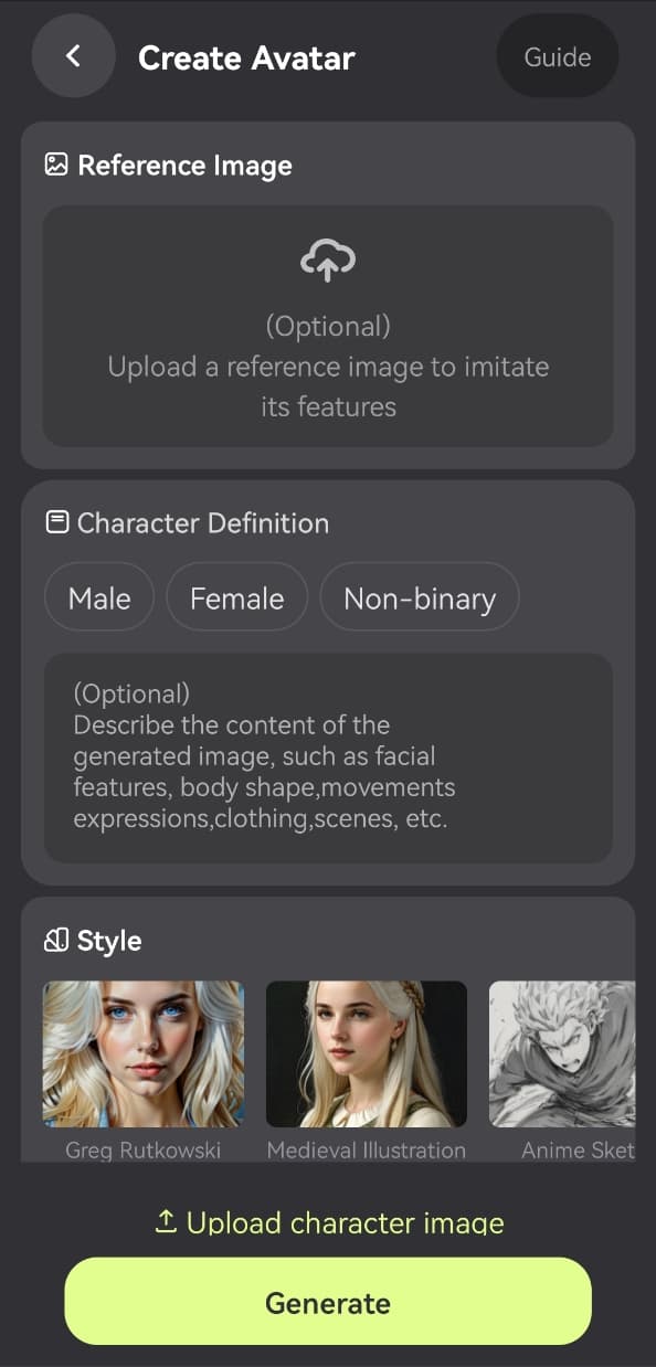 In Character Definition, select your character's gender, then enter details like appearance, build, and pose to generate their portrait. The more detailed your description, the more accurate the generated content will be.
